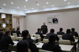 Akademiyanın fakültə, kafedra, kurs, şöbə, bölmə və xidmət rəislərinin iştirakı ilə keçirilən məşğələ “Heydər Əliyev – Azərbaycan Respublikası Silahlı Qüvvələrinin yaradıcısıdır” mövzusuna həsr olunub.