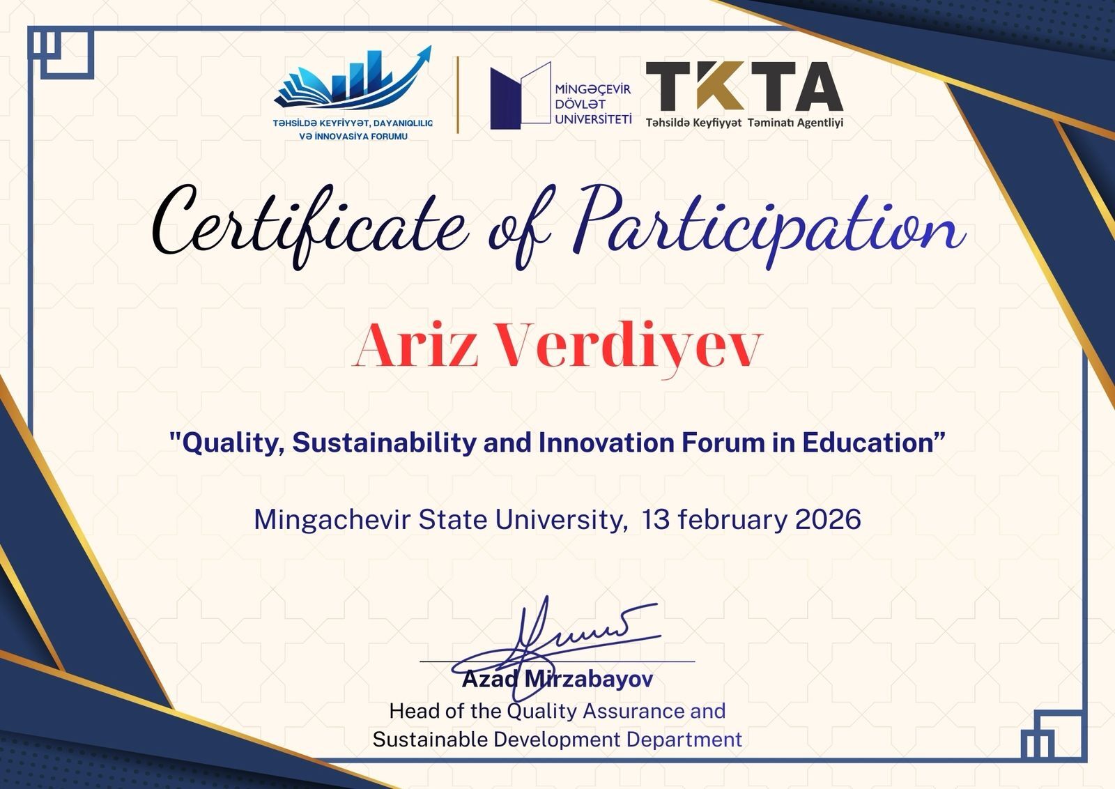 13 fevral 2026-cı il tarixində Mingəçevir Dövlət Universiteti və Elm və Təhsil Nazirliyinin tabeliyində Təhsildə Keyfiyyət Təminatı Agentliyinin birgə təşkilatçılığı ilə “Təhsildə Keyfiyyət, Dayanıqlılıq və İnnovasiya Forumu – 2026” adlı tədbir keçirilib.